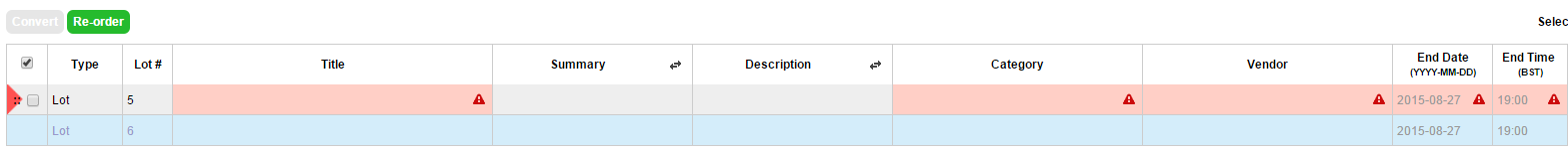 - The following fields in red below must be filled out - Title, Category, Vendor, End date, End time, Bid Increment (Bid Increment is only applicable if Items are set as 'Lots') Note: Default Auto/Dynamic bidding increments for Timed Auctions are set up at Auctioneer level.