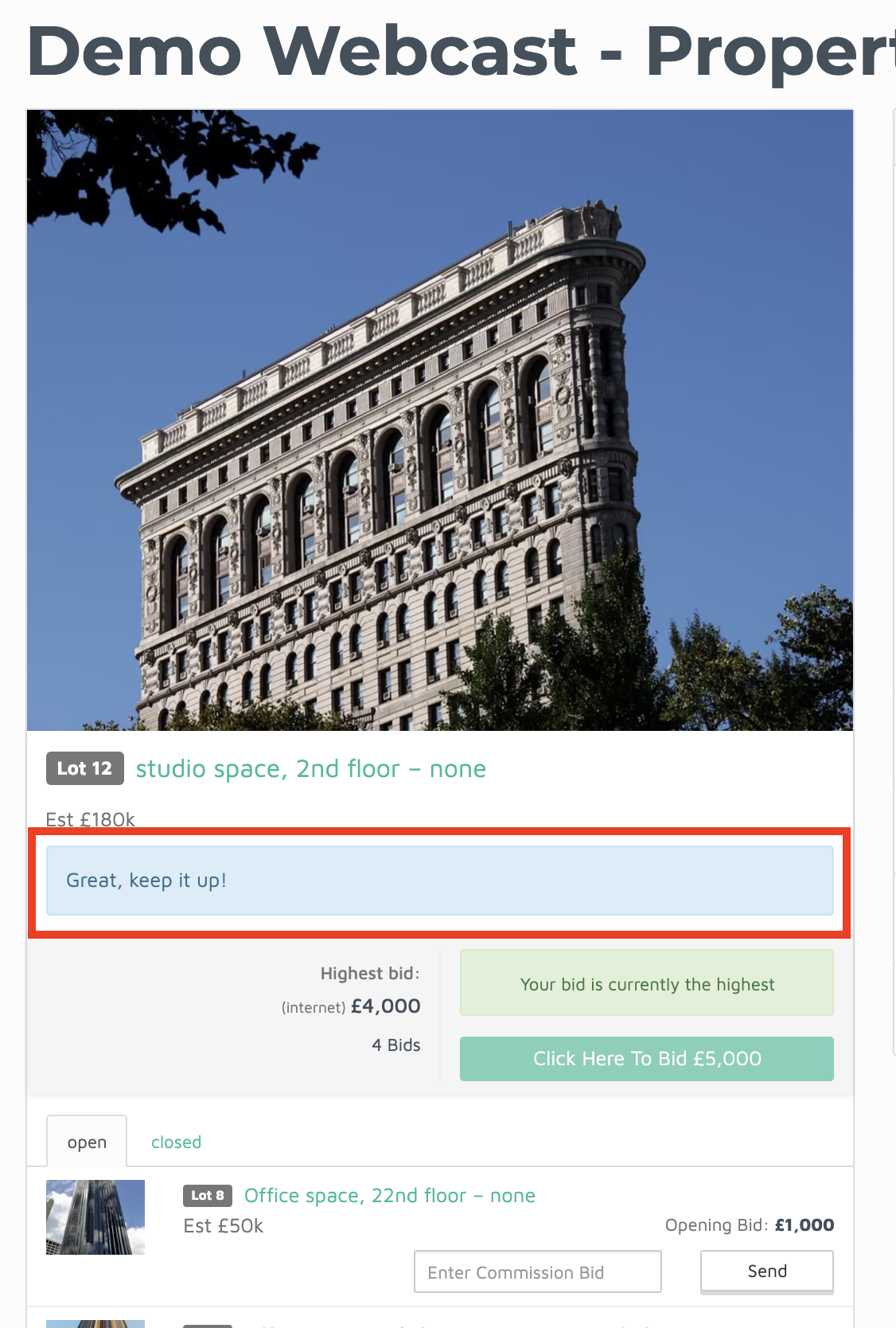 The same rule applies for clearing an Auction message as with an Item message (see above). Auction messages will not auto-clear when the next item is sent into the ring.