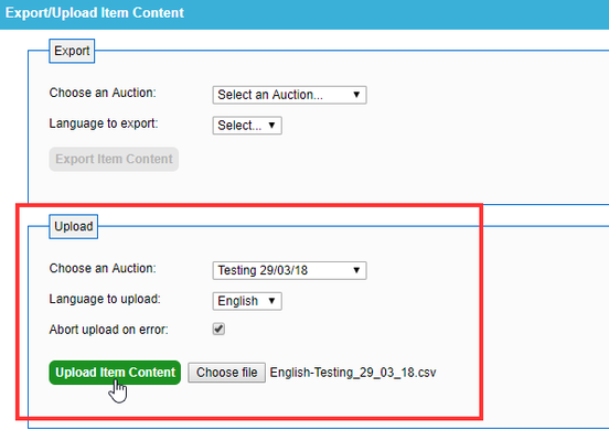 - In the Upload section, choose the correct auction from the Select an Auction... drop down menu.