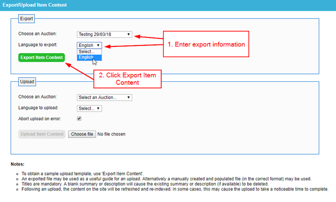 This document explains how to download existing auction item information, edit it and re-upload it. This is predominantly used for translating item information into other languages but, in certain circumstances, can be used to edit items in their original language. We highly recommend you contact support@bidlogix.net before proceeding with this type of edit, especially if this is your first edit or if you have not performed this action for a long time.